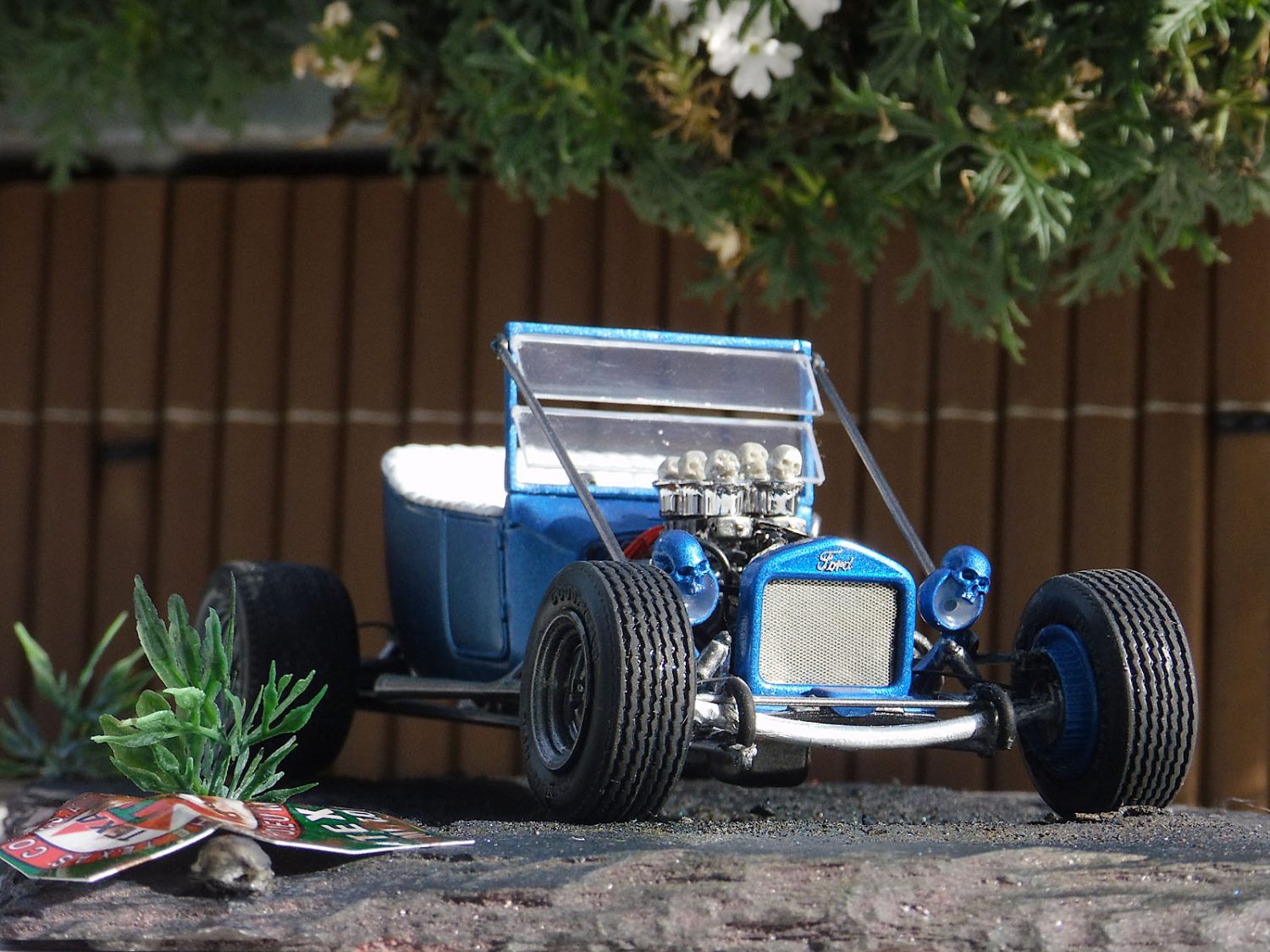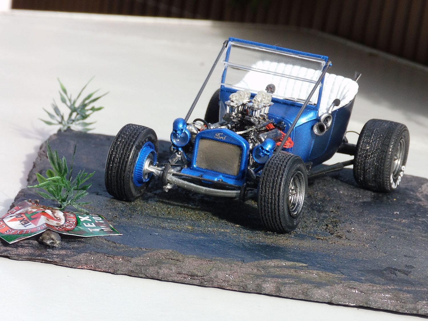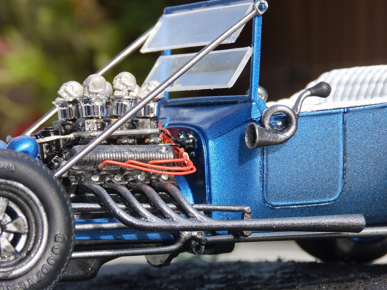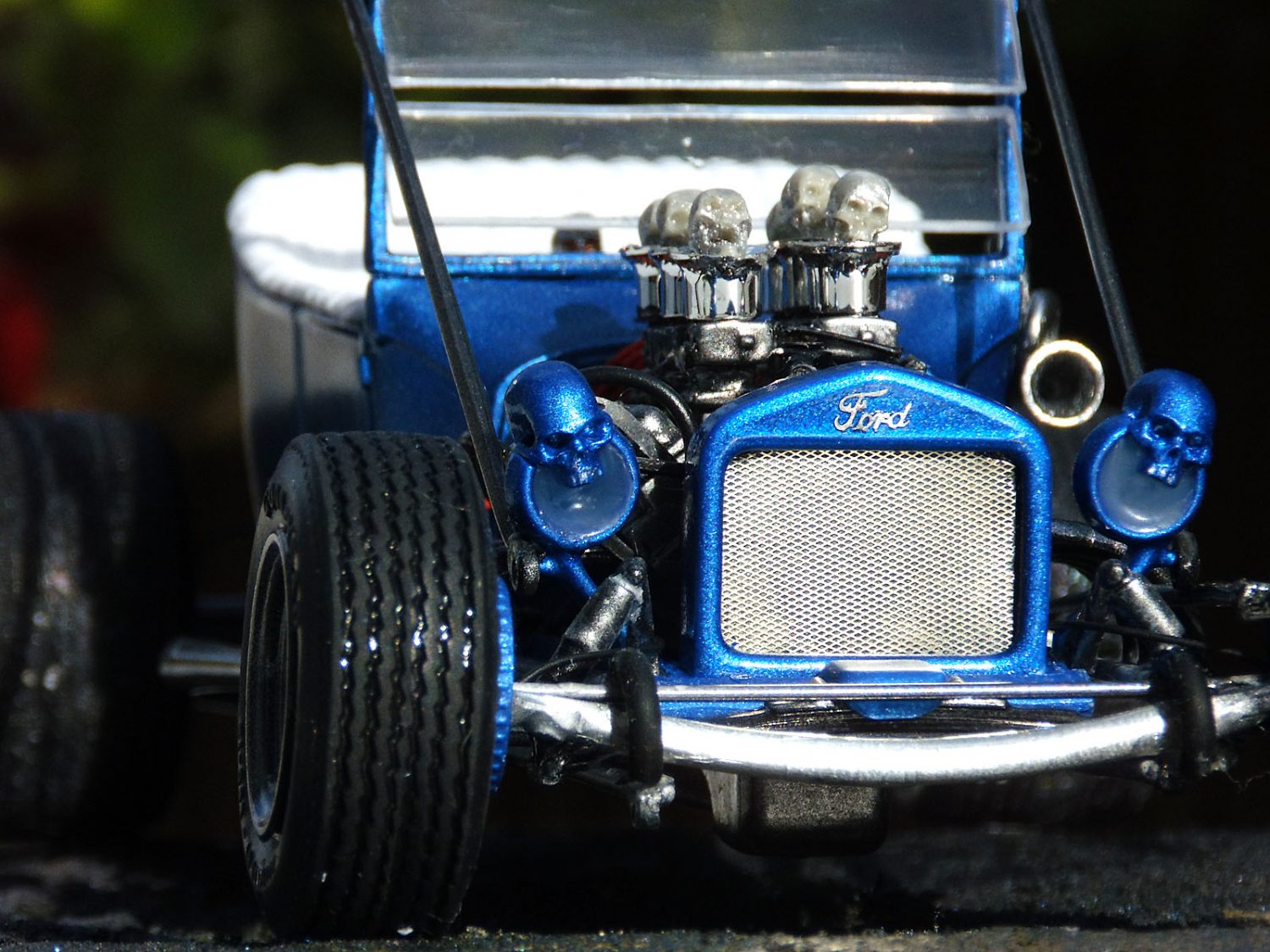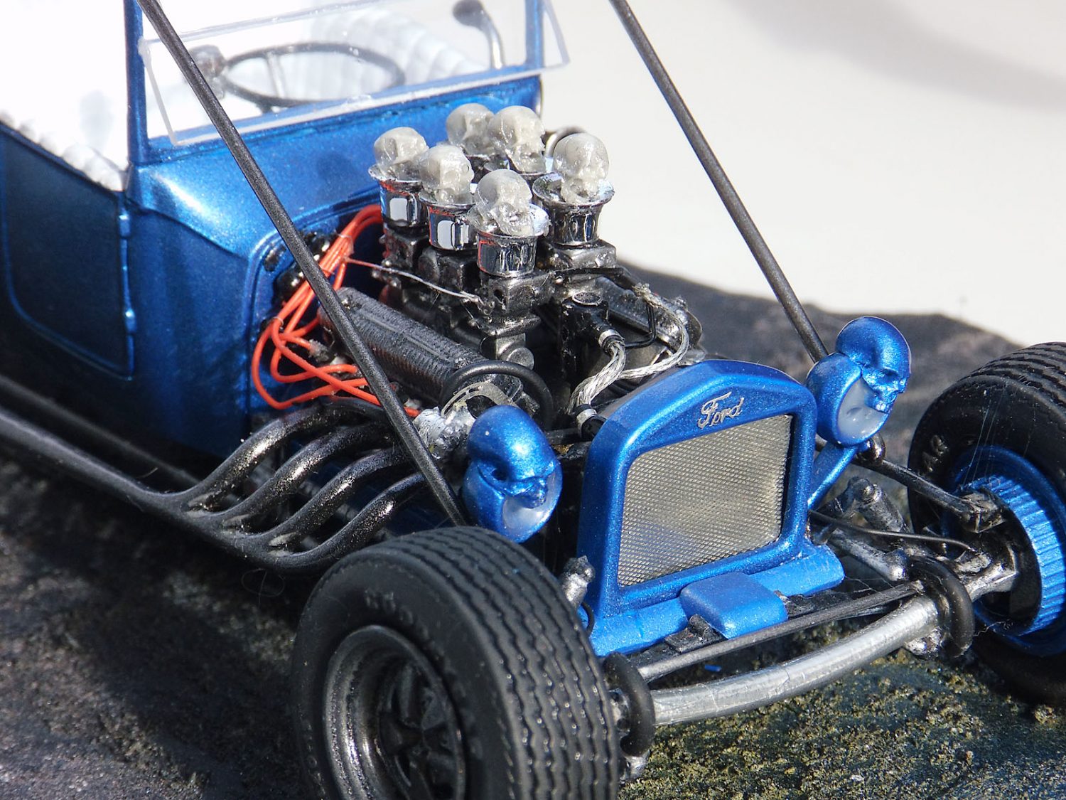 Ein heißes Gerät von AMT im Maßstab 1/25 stellte unser Ronny Oehm mit dem Ford Model T auf die Räder. Er betrieb dabei ein wenig Customizing und verwendete Ätzteile von Model Car Garage sowie Mr. Model. Der Zündverteiler stammt von Detail Master, die Zündkerzen von MBM und die Schädel von Drakkar-Models.
