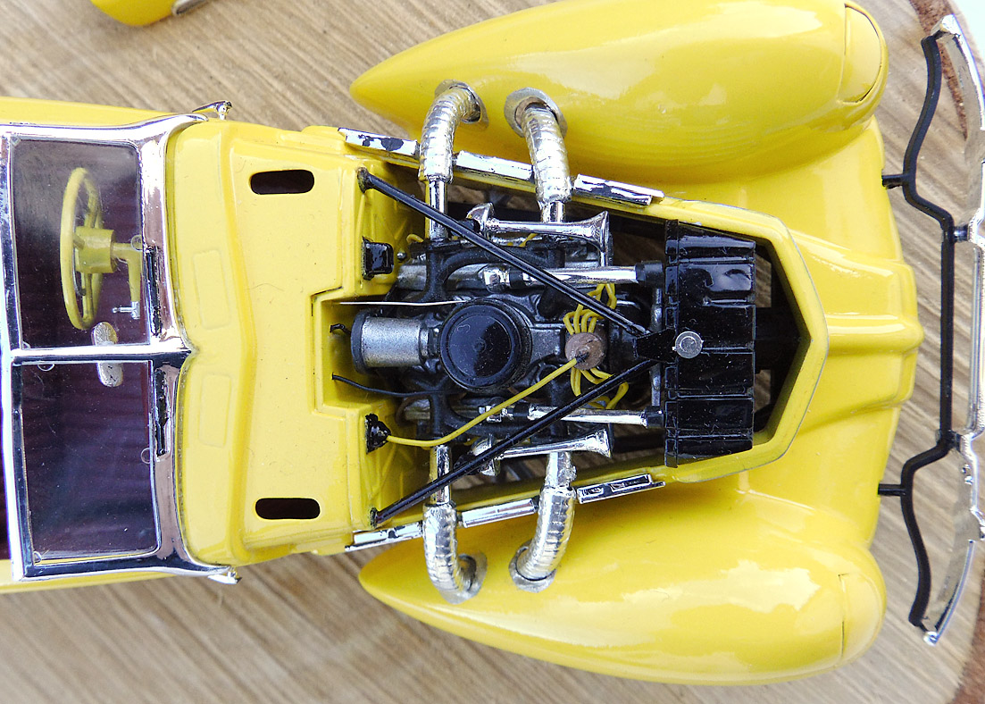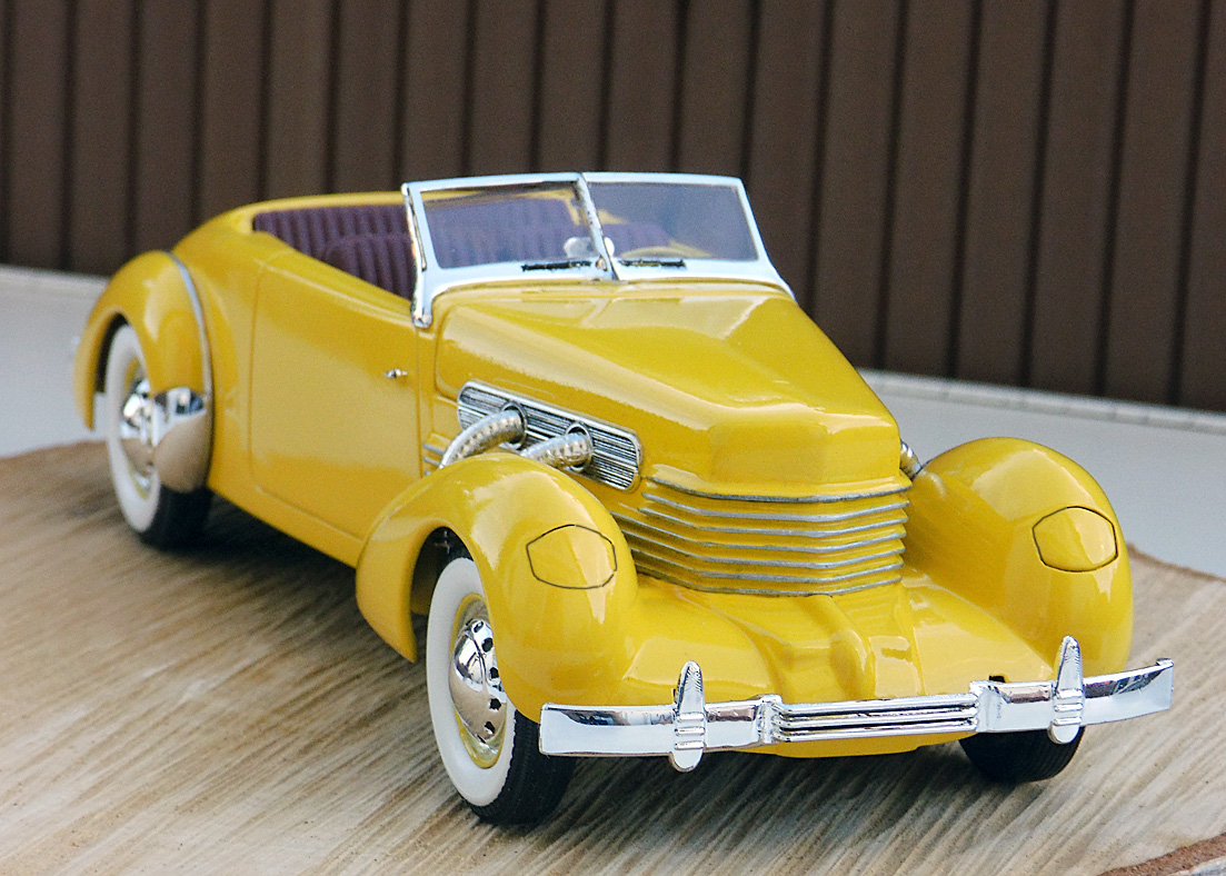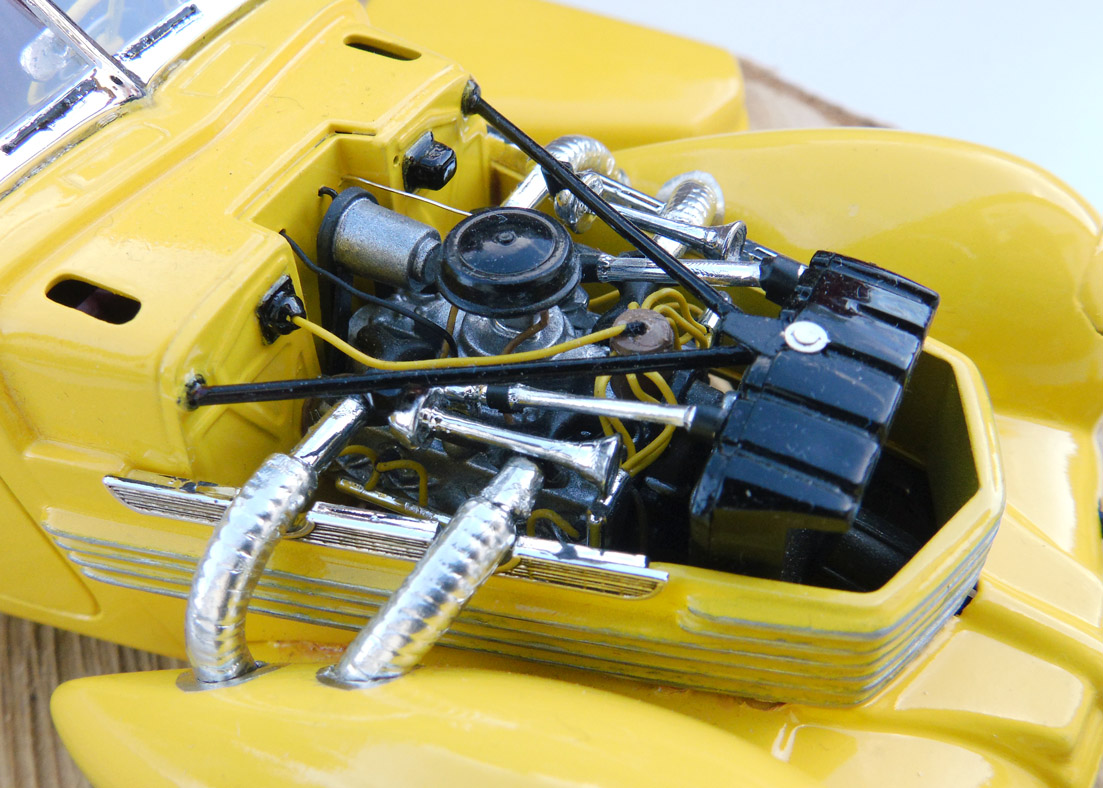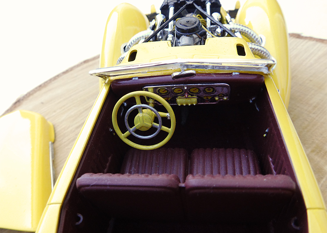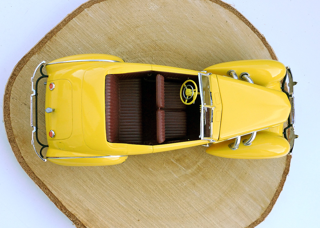 Dieser gelbe Cord 812 oder wie unser Ronny Oehm selbst über sein Modell sagen würde, sein „Mickey Mouse“ Auto ist ein Bausatz in 1/24 von Monogram. Den Bau erledigte Ronny Out of Box, verbesserte aber diverse Details am Motor mit Kabeln, Schläuchen und Bare Metal Folie. Im Innenraum verwendet er noch Teppichflocking und auch zusätzliche Teile, die im Bausatz nicht vorgesehen waren.