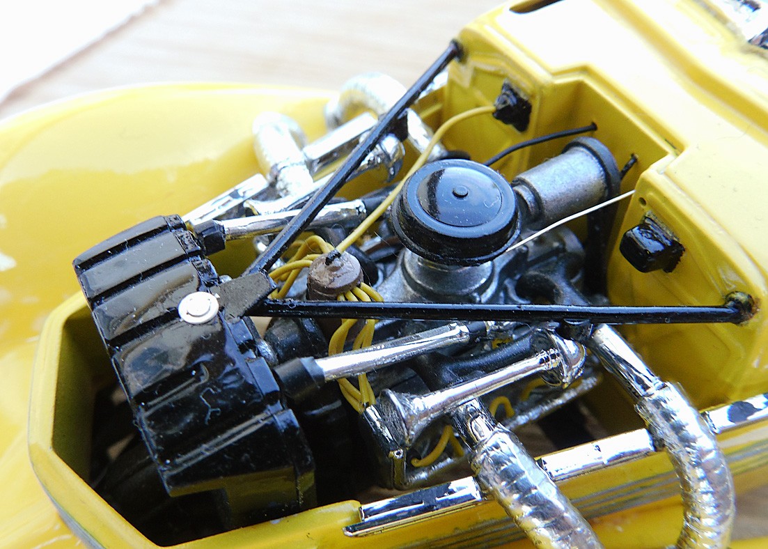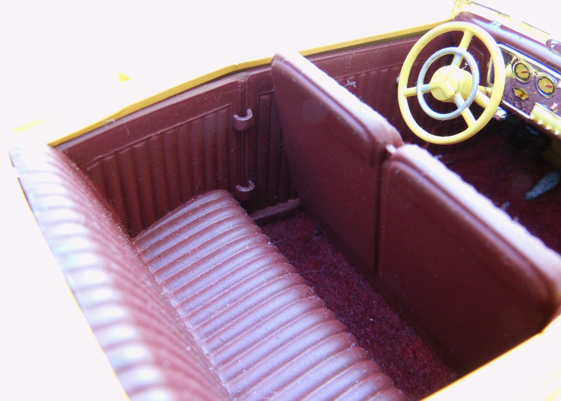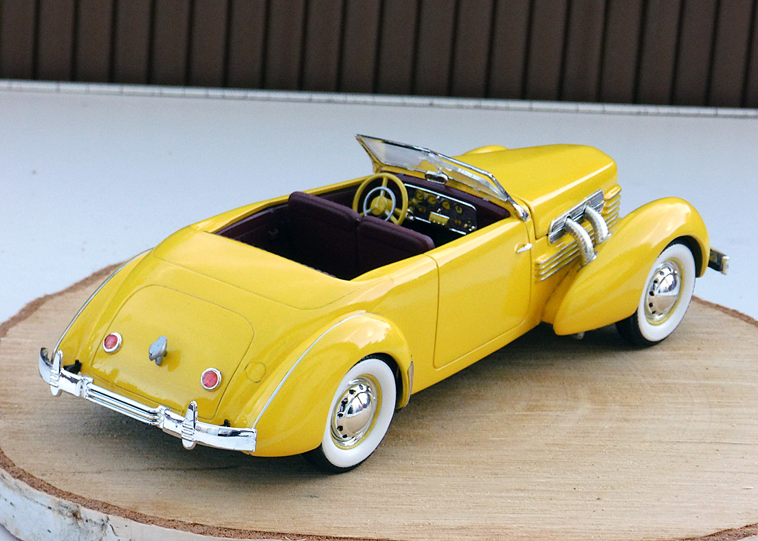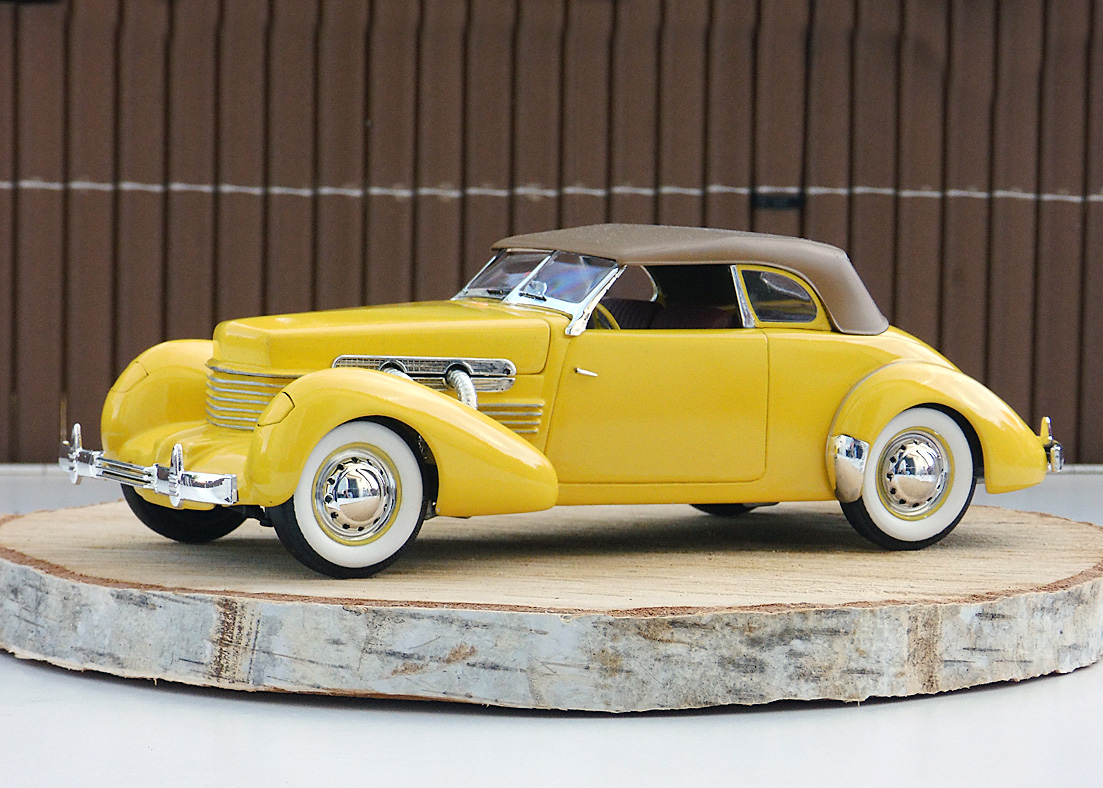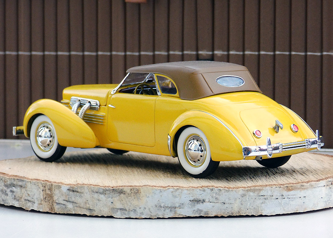 Dieser gelbe Cord 812 oder wie unser Ronny Oehm selbst über sein Modell sagen würde, sein „Mickey Mouse“ Auto ist ein Bausatz in 1/24 von Monogram. Den Bau erledigte Ronny Out of Box, verbesserte aber diverse Details am Motor mit Kabeln, Schläuchen und Bare Metal Folie. Im Innenraum verwendet er noch Teppichflocking und auch zusätzliche Teile, die im Bausatz nicht vorgesehen waren.