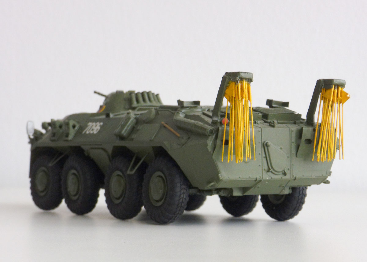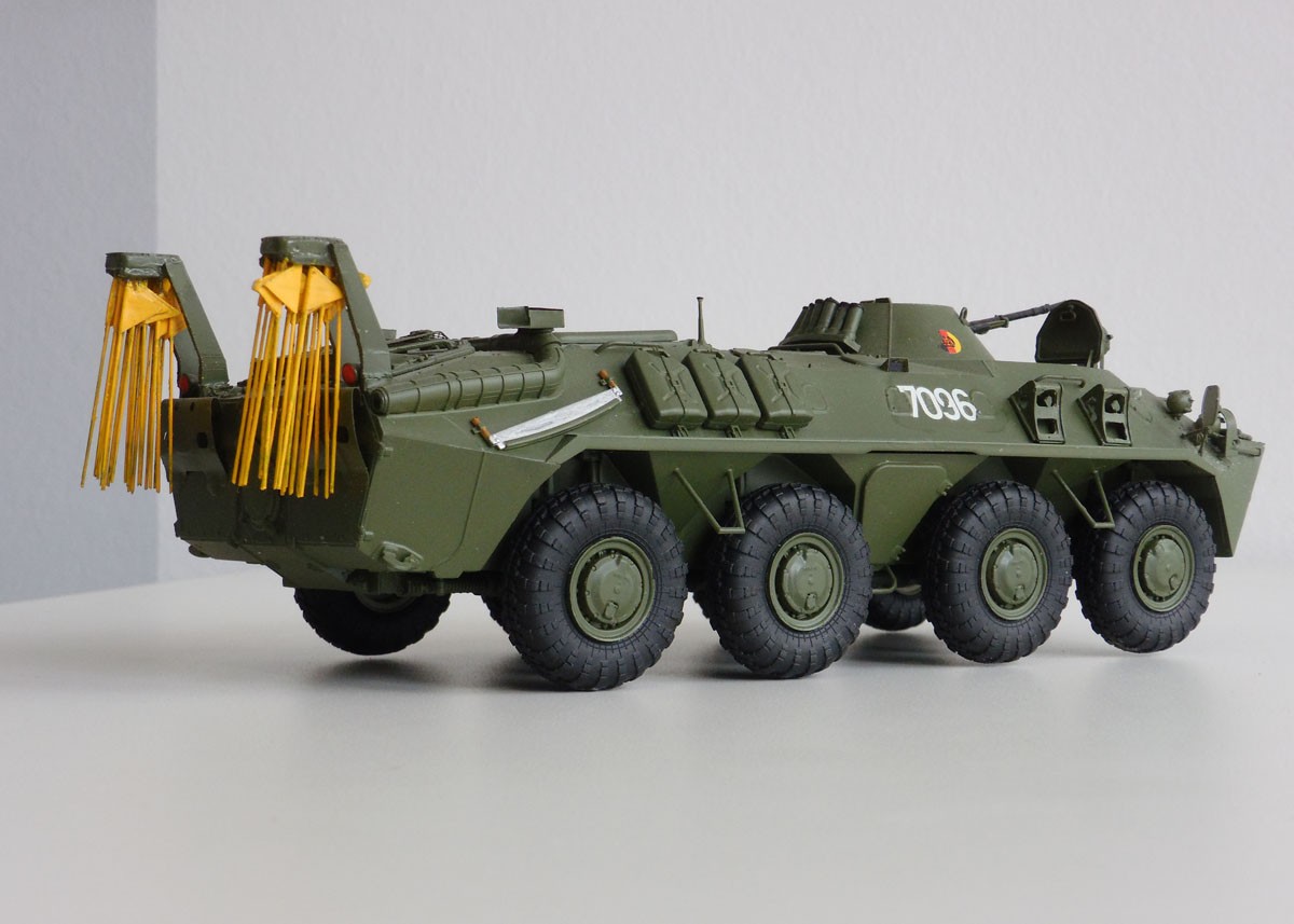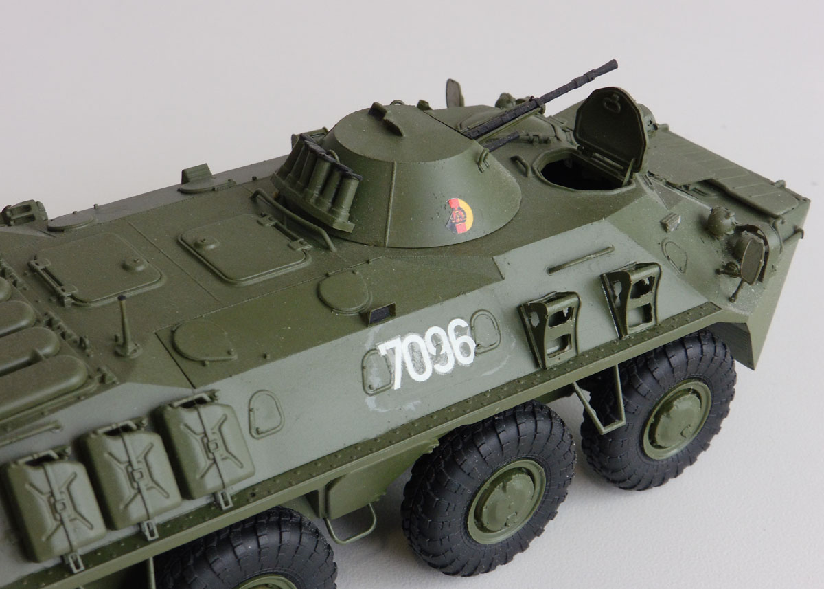 Aus sowjetischer Produktion stammt dieser BTR-70, ein Schützenpanzer, der in den Streitkräften der DDR als SPW-70 diente. Unser Jan Poppe baute das Modell im Maßstab 1/35 von Trumpeter zum SPW-70CH um. Dieser Typ war als Aufklärungsfahrzeug zum Aufspüren von chemischen Kampfstoffen oder radioaktiver Strahlung gedacht. Dazu nutzte Jan einen Zurüstsatz von MR Models und Decals von TL-Decals. Einige Details erledigte er scratch.