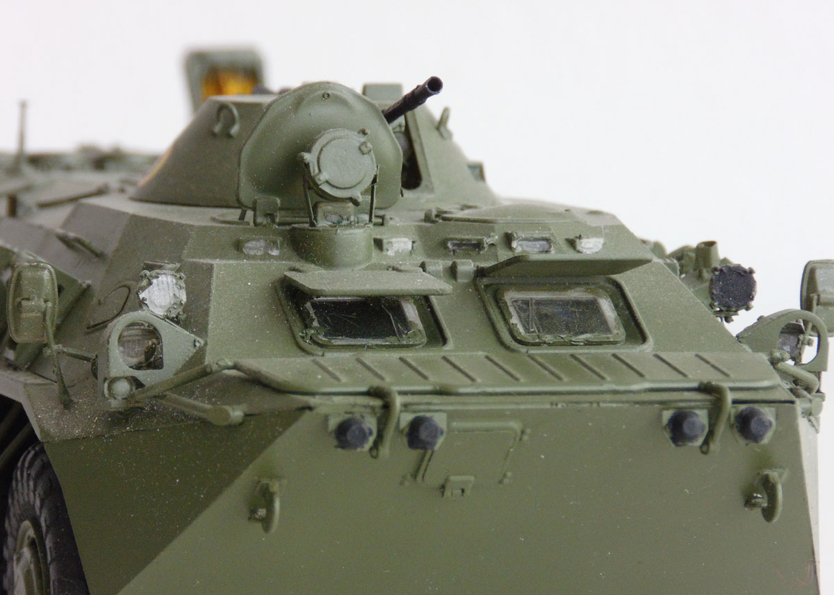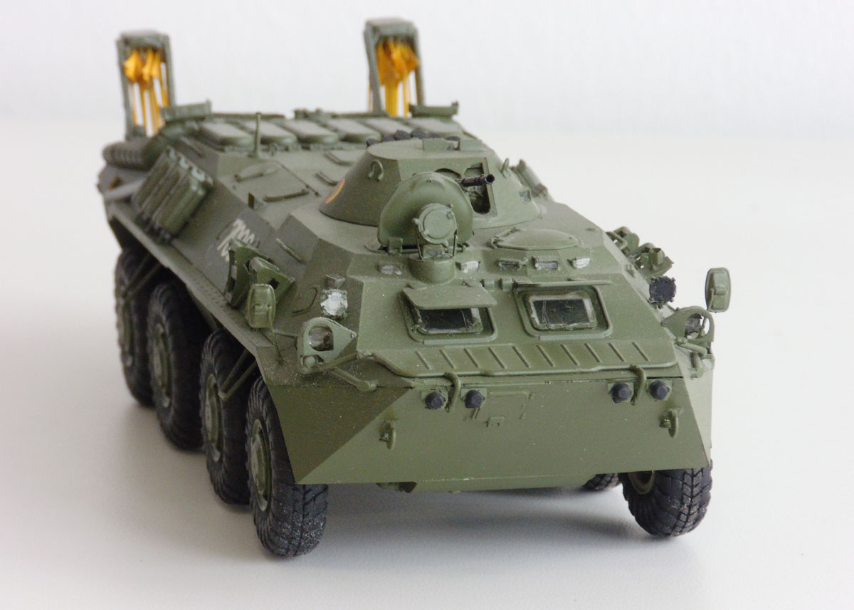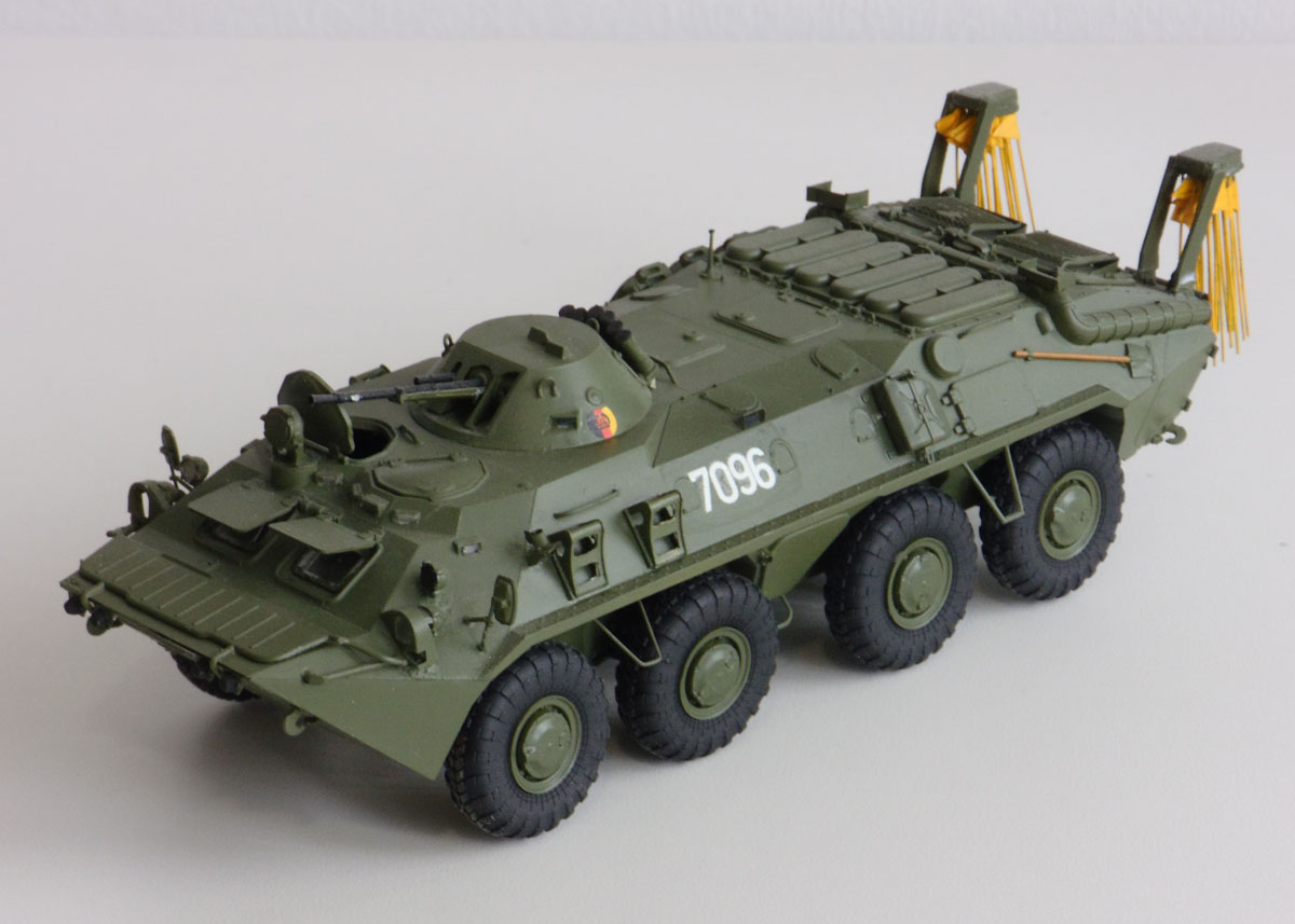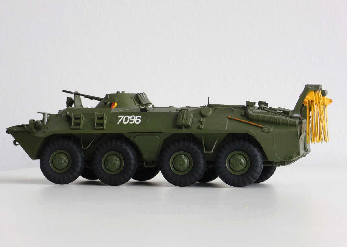 Aus sowjetischer Produktion stammt dieser BTR-70, ein Schützenpanzer, der in den Streitkräften der DDR als SPW-70 diente. Unser Jan Poppe baute das Modell im Maßstab 1/35 von Trumpeter zum SPW-70CH um. Dieser Typ war als Aufklärungsfahrzeug zum Aufspüren von chemischen Kampfstoffen oder radioaktiver Strahlung gedacht. Dazu nutzte Jan einen Zurüstsatz von MR Models und Decals von TL-Decals. Einige Details erledigte er scratch.