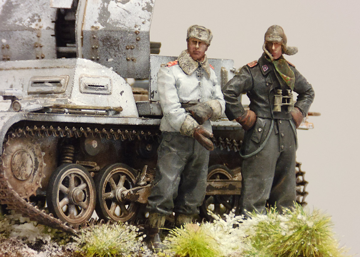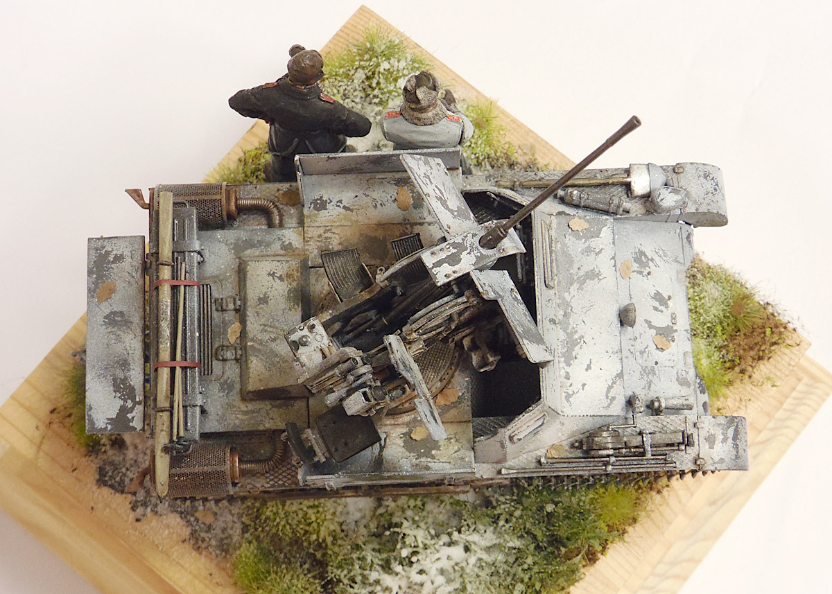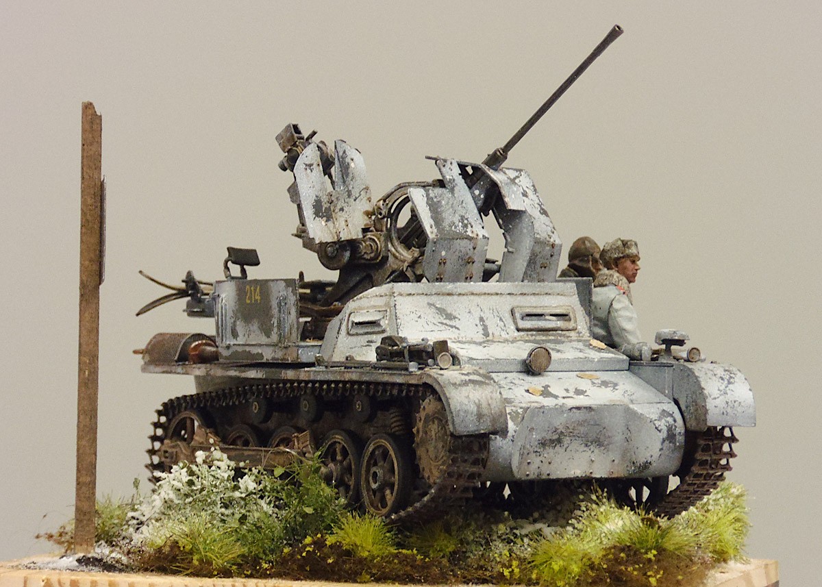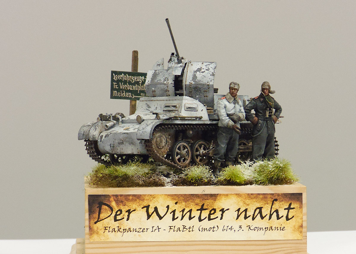 Hier gibt es noch ein Modell von unserem Lucas Neubert zu sehen. In 1/35 von der Firma Tristar baute Lucas den Flakpanzer 1A im Wintertarnkleid auf einer kleinen Base. Die Lackabplatzer gestaltete er mittels der Haarspraymethode und der Schnee rieselte als Natron „vom Himmel“. Die Figuren stammen von Alpine, lackiert natürlich in Eigenarbeit.