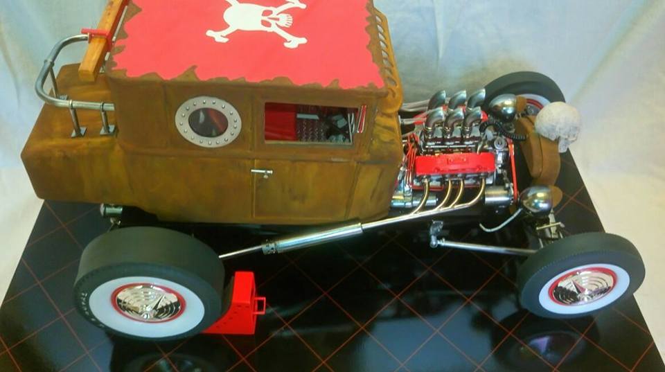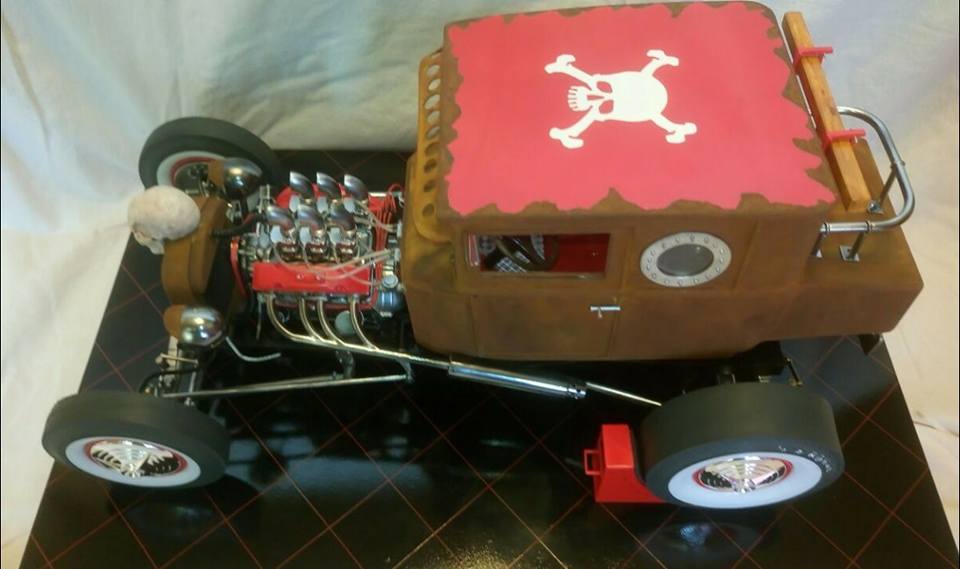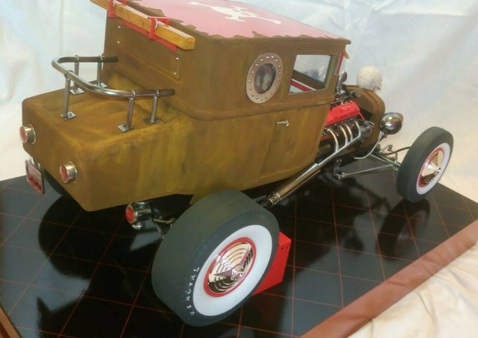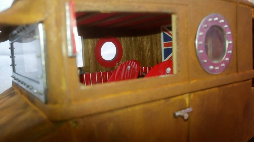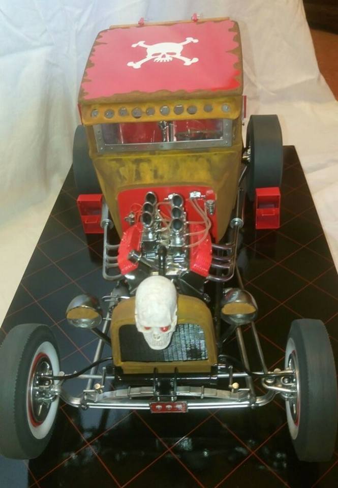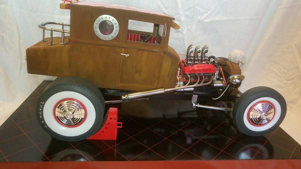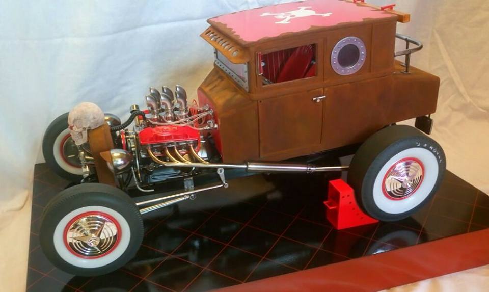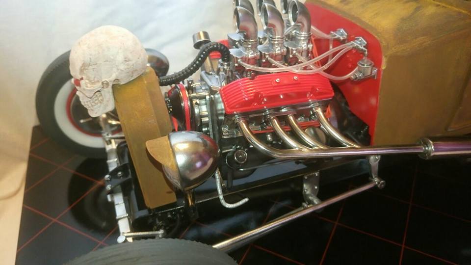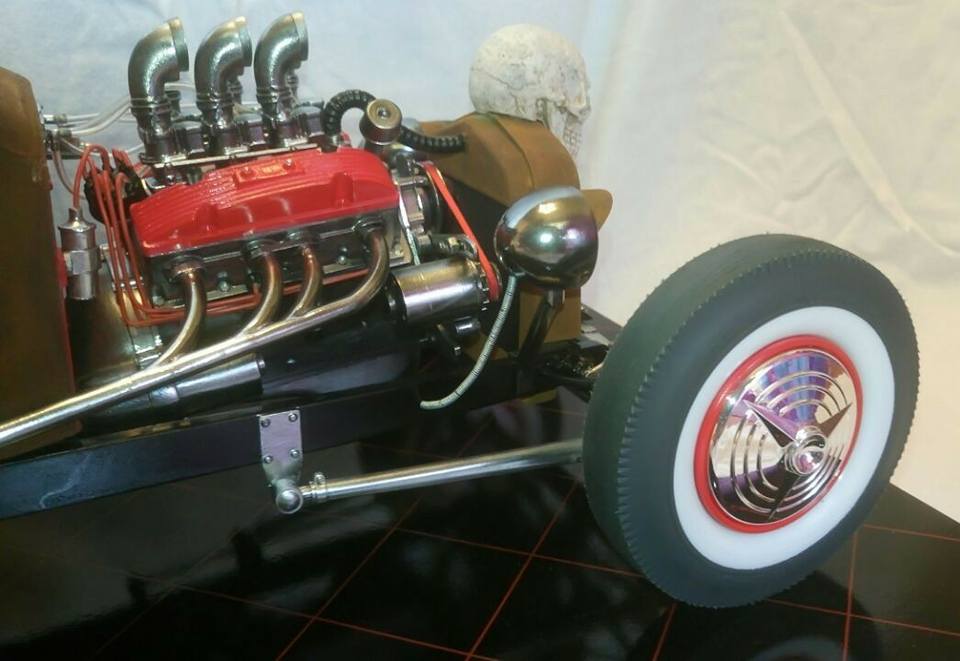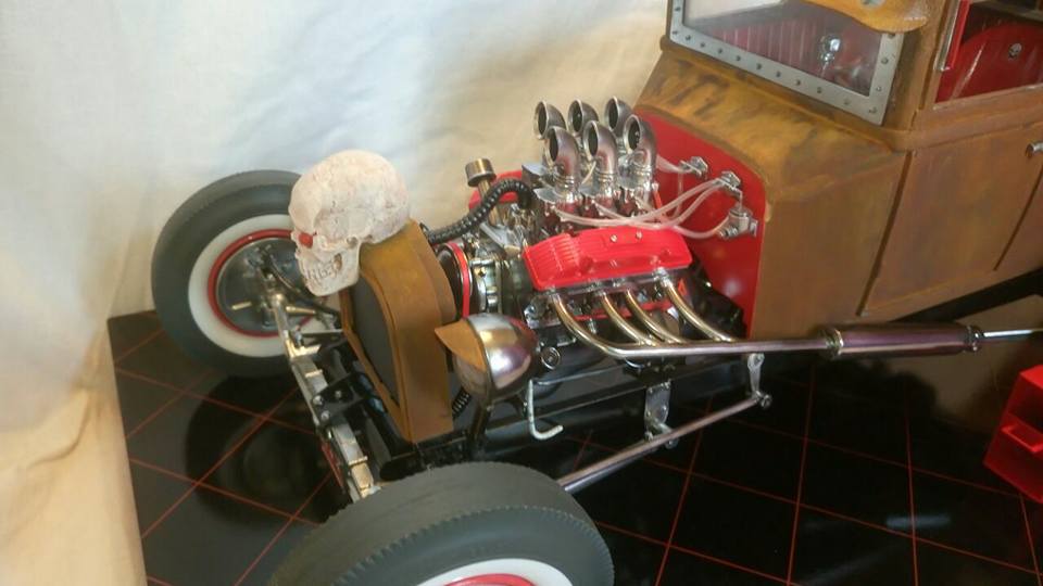 Das ist Thomas Slopianka sein zum Hot Rod umgebauter Ford Model T im Maßstab 1/08 von Lindberg. Thomas choppte das Dach und baute runde Fenster scratch ein. Den Innenraum verkleidete er mit Echtholz. Ebenfalls scratch entstand der Gepäckträger und eine Halterung mit Kantholz, also ein Henkel zum wegschmei…. ähm ja. An der Technik bastelte Thomas auch noch herum. So wurde der Auspuff verlängert und ein Keilriemen, so wie Schläuche, Leitungen und Scheinwerferblenden angebracht.