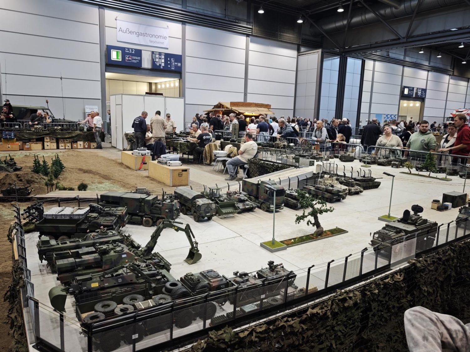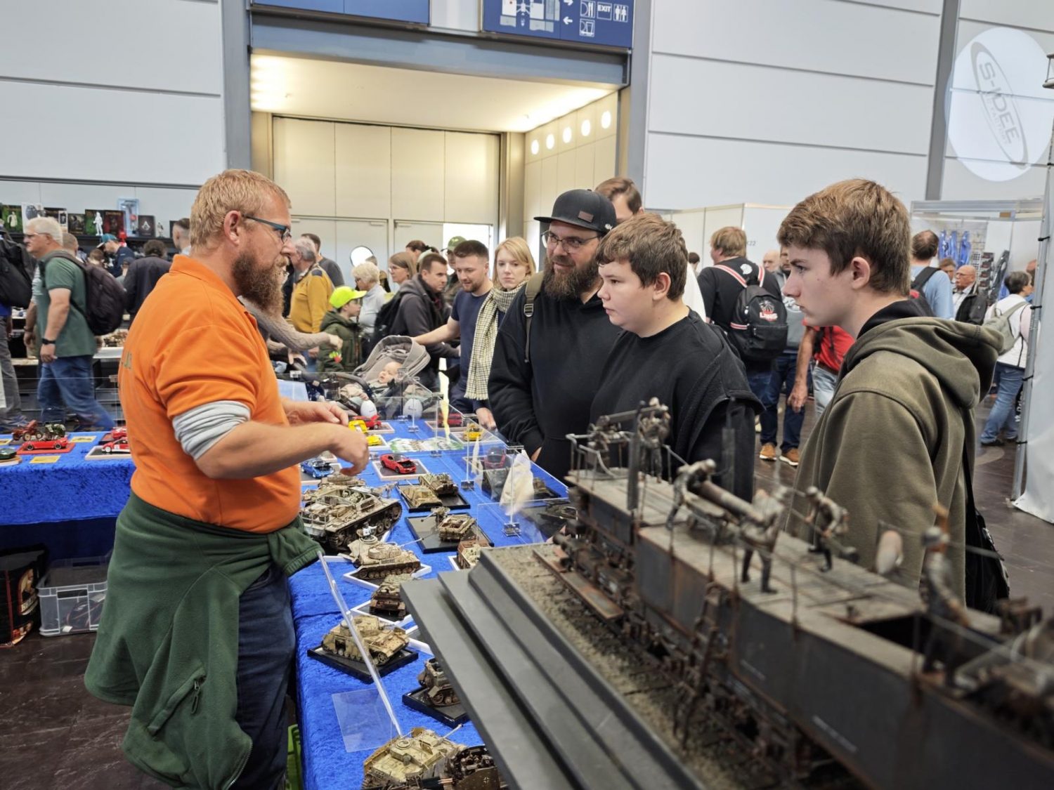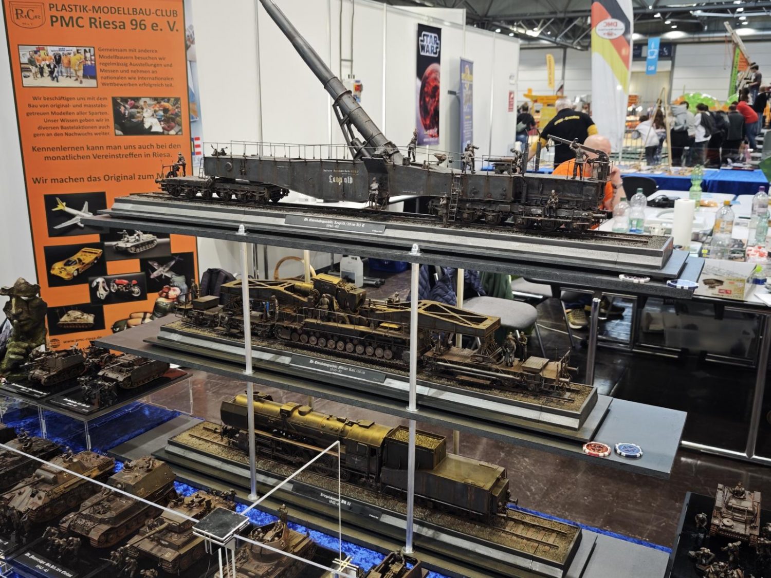 Kurz vor zehn wurde das Licht hochgefahren und die liebliche Stimme aus dem Lautsprecher verkündete das Öffnen der Türen und begrüßte die ersten Besucher. Das da wohl dank dem Feiertag einiges an Leuten unterwegs war, merkten wir dann etwas später auch. Wir hatten erst die Befürchtung, dass die Lage am Rand der Halle für weniger Besucher sorgen könnte, aber das eigentliche Gegenteil war der Fall, denn wir konnten reichlich bewundernde Blicke über unsere Tische sehen und auch einige interessante Gespräche kamen zustande. Dieses Jahr war unser Klaus mit seinen Eisenbahngeschützen der Magnet. Er ist ja erst seit diesem Jahr bei uns im Verein, aber man kann schon sehen, dass er bereits gute Fortschritte durch Tipps und Tricks von den Kollegen innerhalb dieser Zeit gemacht hat. Hut ab und weiter so!