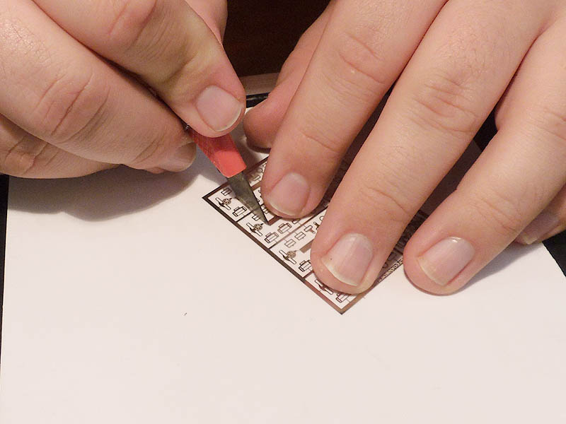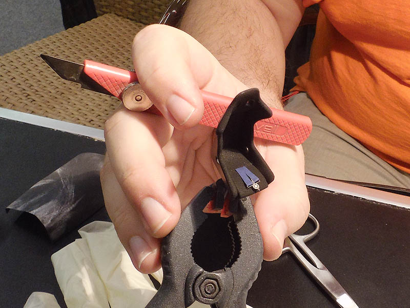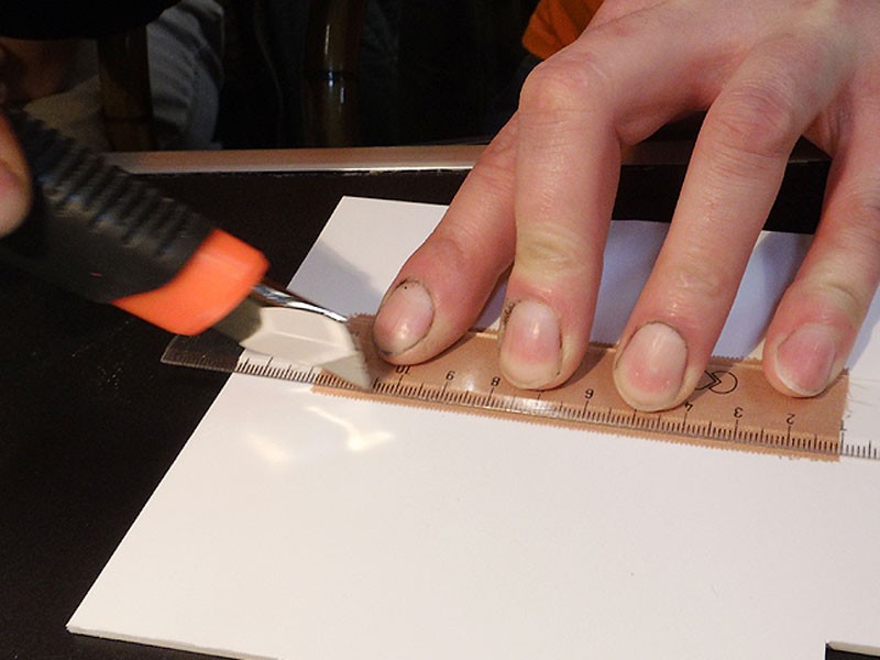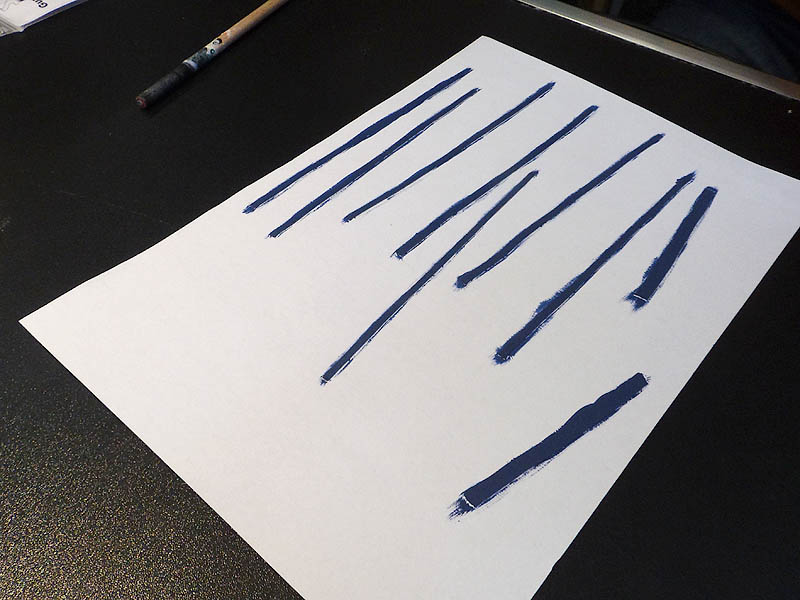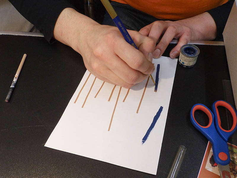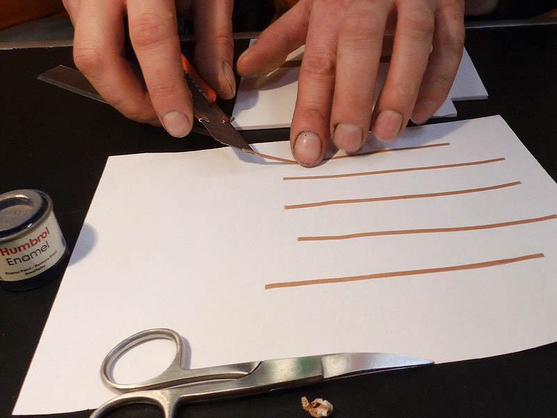 Danach wird der geriffelte Rand abgeschnitten, verworfen und der Rest in mehrere dünne Streifen (ca. 4mm) für die Gurte geschnitten Diese werden dann mit Modellbaufarbe und Pinsel in der gewünschten Farbe lackiert. (bei uns ist es blau für einen Peugeot 206 WRC)