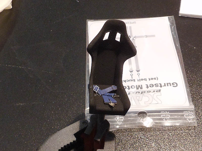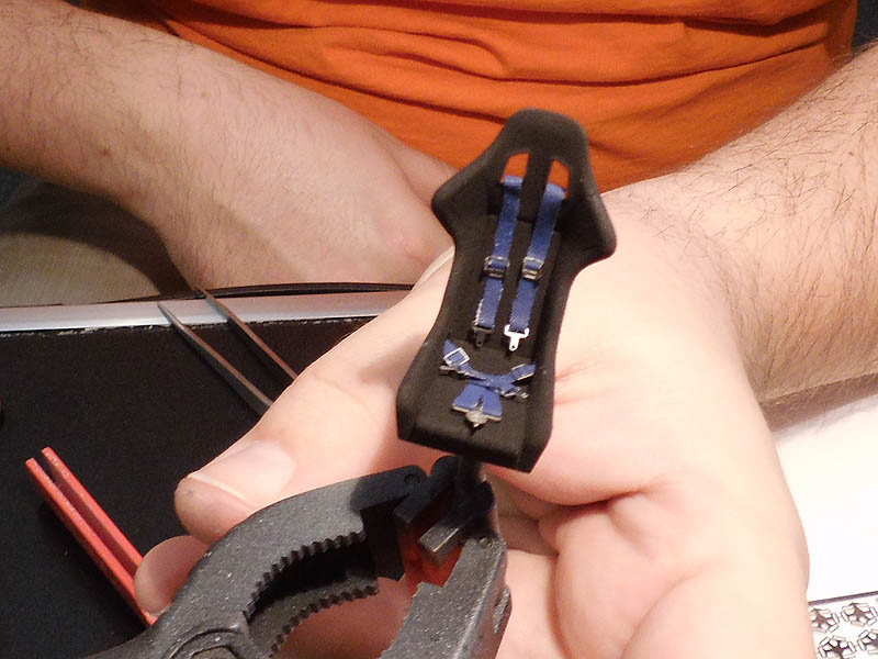 Als letztes werden die Gurte durch die Löcher im Sitz geführt und die Enden am Fahrzeug verbaut. Dadurch, dass die Gurte ja eine klebende Seite haben halten sie auch super. Falls das mal nicht der Fall ist, kommt ein bisschen Sekundenkleber zum Einsatz und fertig ist das Renngestühl.