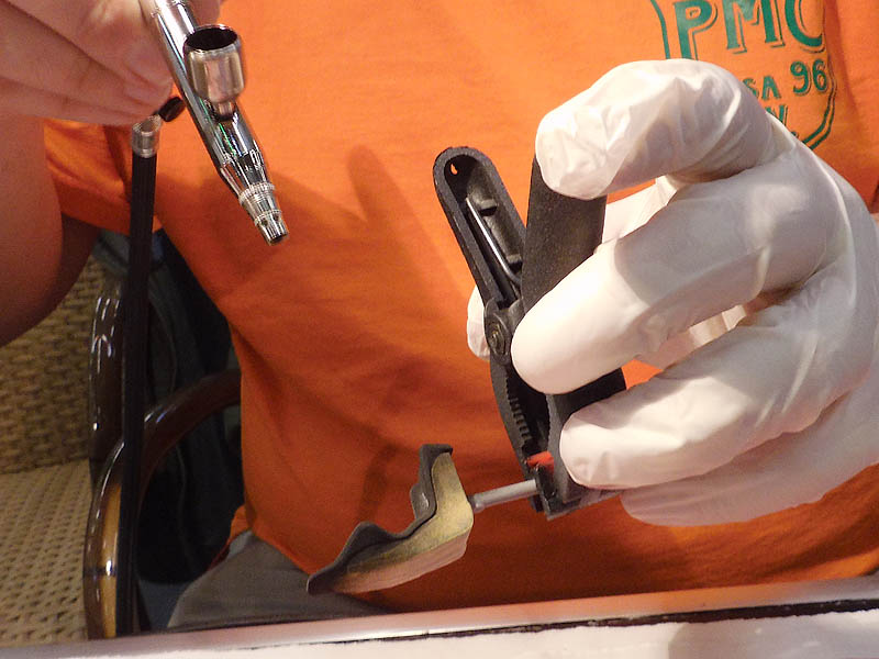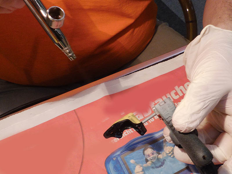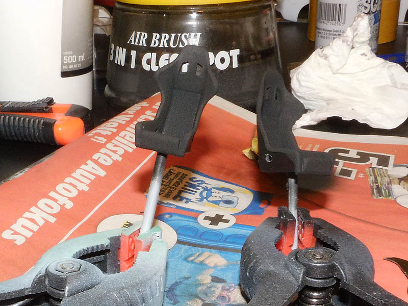Jetzt wird der Sitz mit der Airbrushpistole richtig satt lackiert. Dose oder Pinsellackierung eignen sich nur bedingt, da sich in den Sicken der Sitze schnell zu viel Farbe sammelt, was den Gesamteindruck am Schluss schädigen kann. Als Farbe eignet sich alles was klebt und nicht zu schnell trocknet.