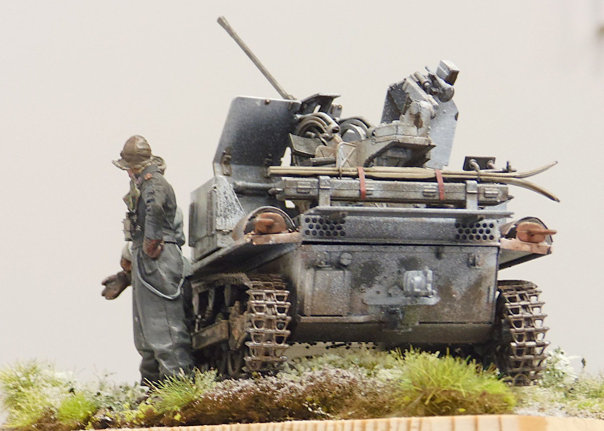 Hier gibt es noch ein Modell von unserem Lucas Neubert zu sehen. In 1/35 von der Firma Tristar baute Lucas den Flakpanzer 1A im Wintertarnkleid auf einer kleinen Base. Die Lackabplatzer gestaltete er mittels der Haarspraymethode und der Schnee rieselte als Natron „vom Himmel“. Die Figuren stammen von Alpine, lackiert natürlich in Eigenarbeit.