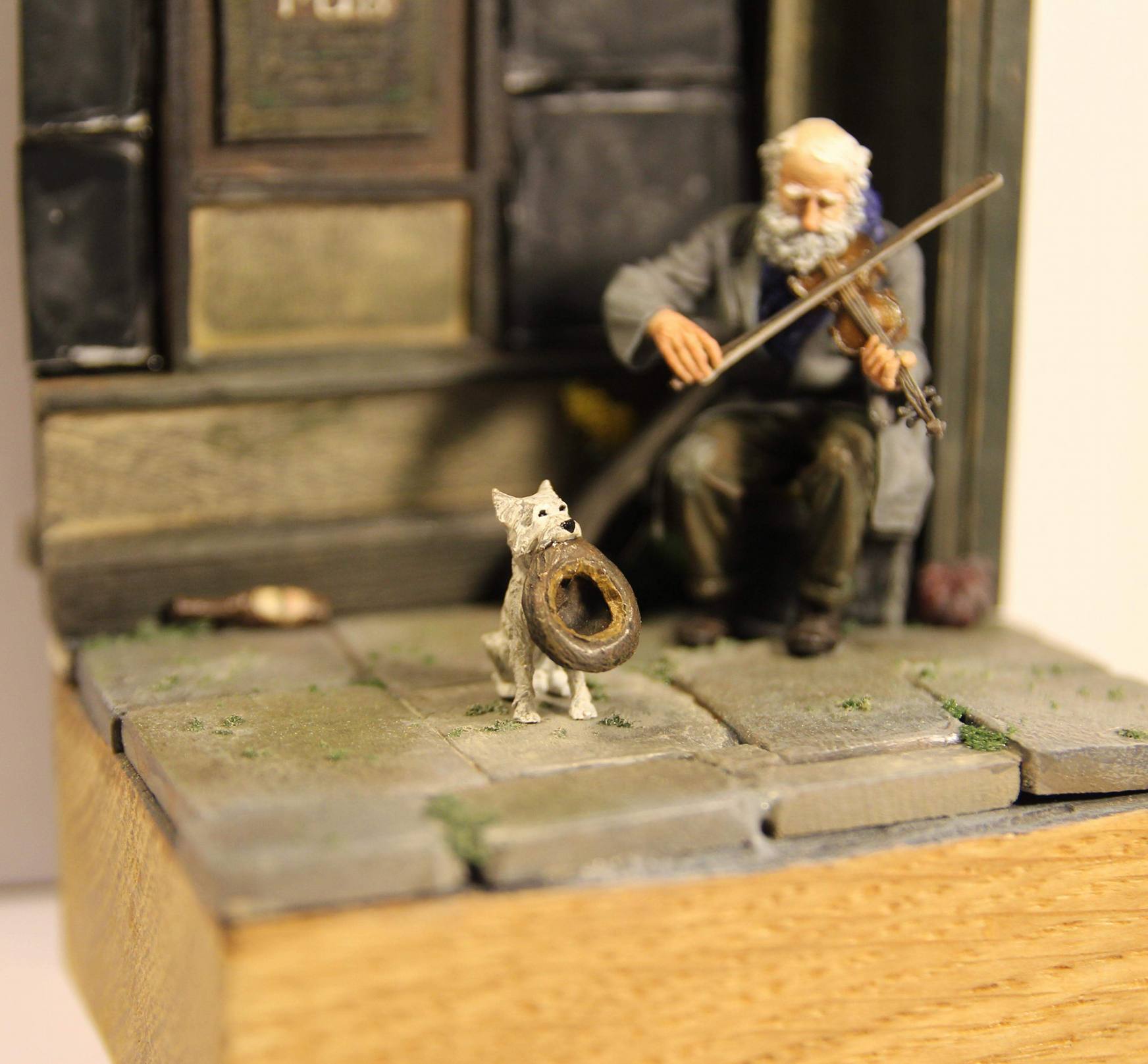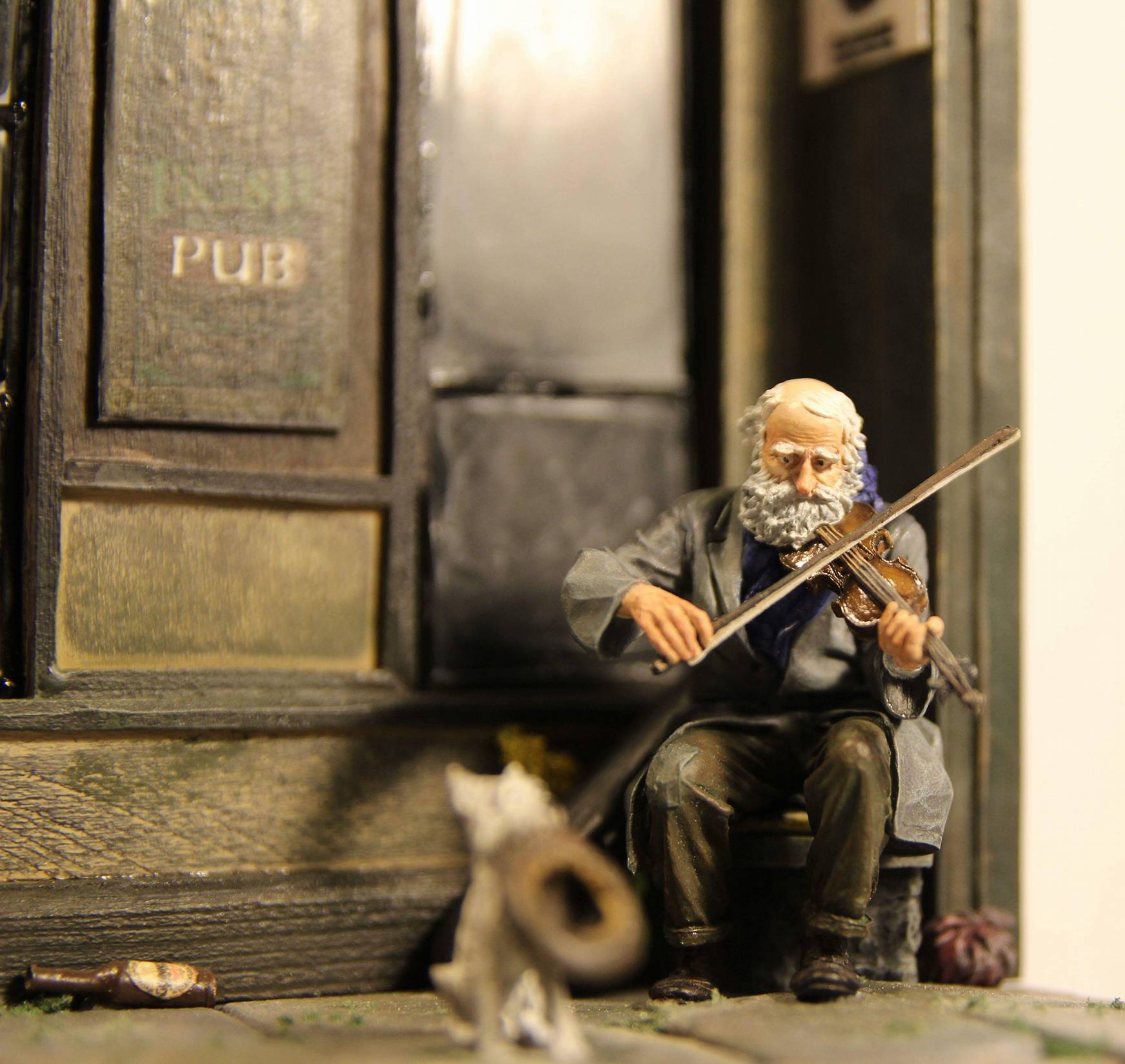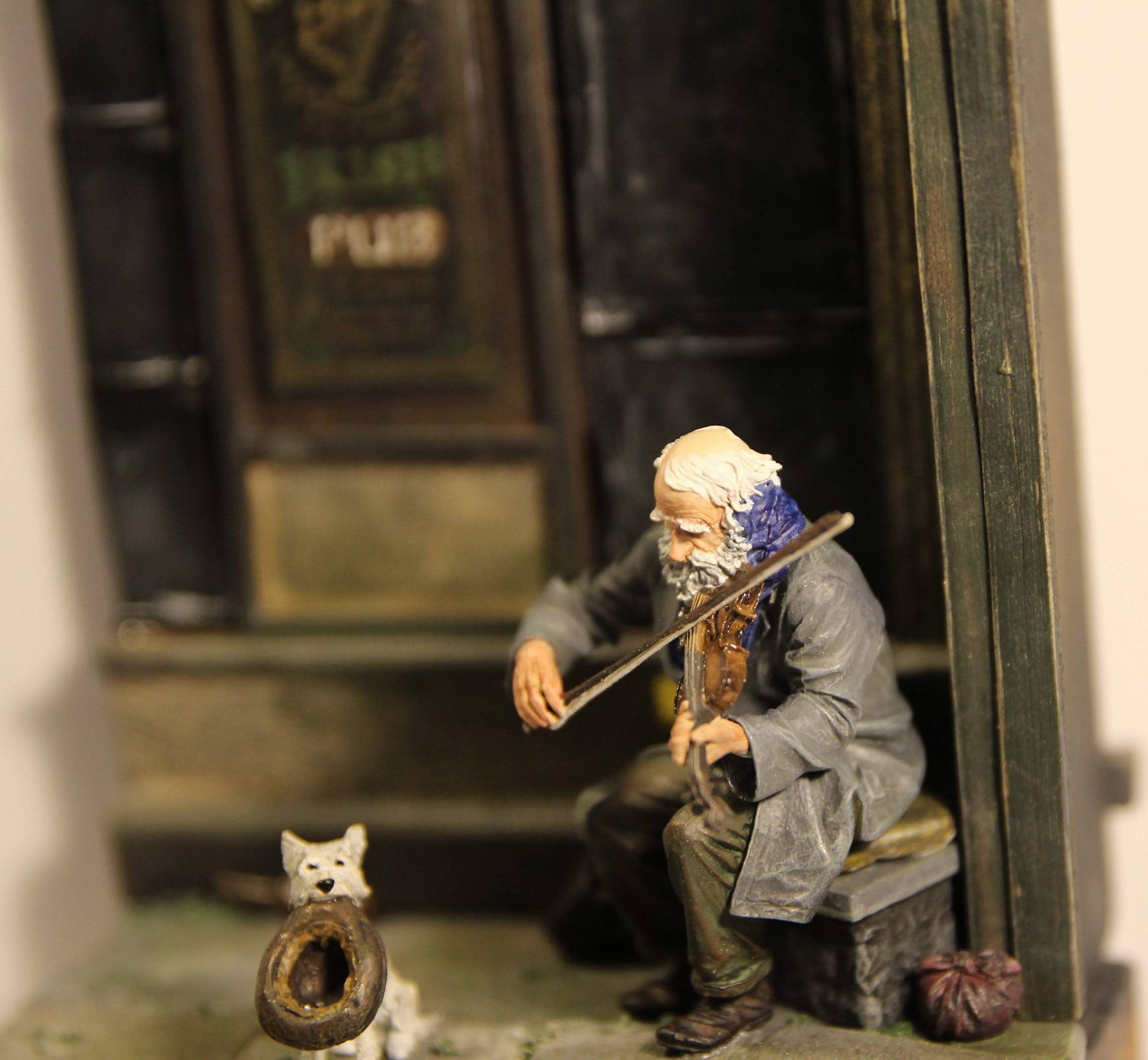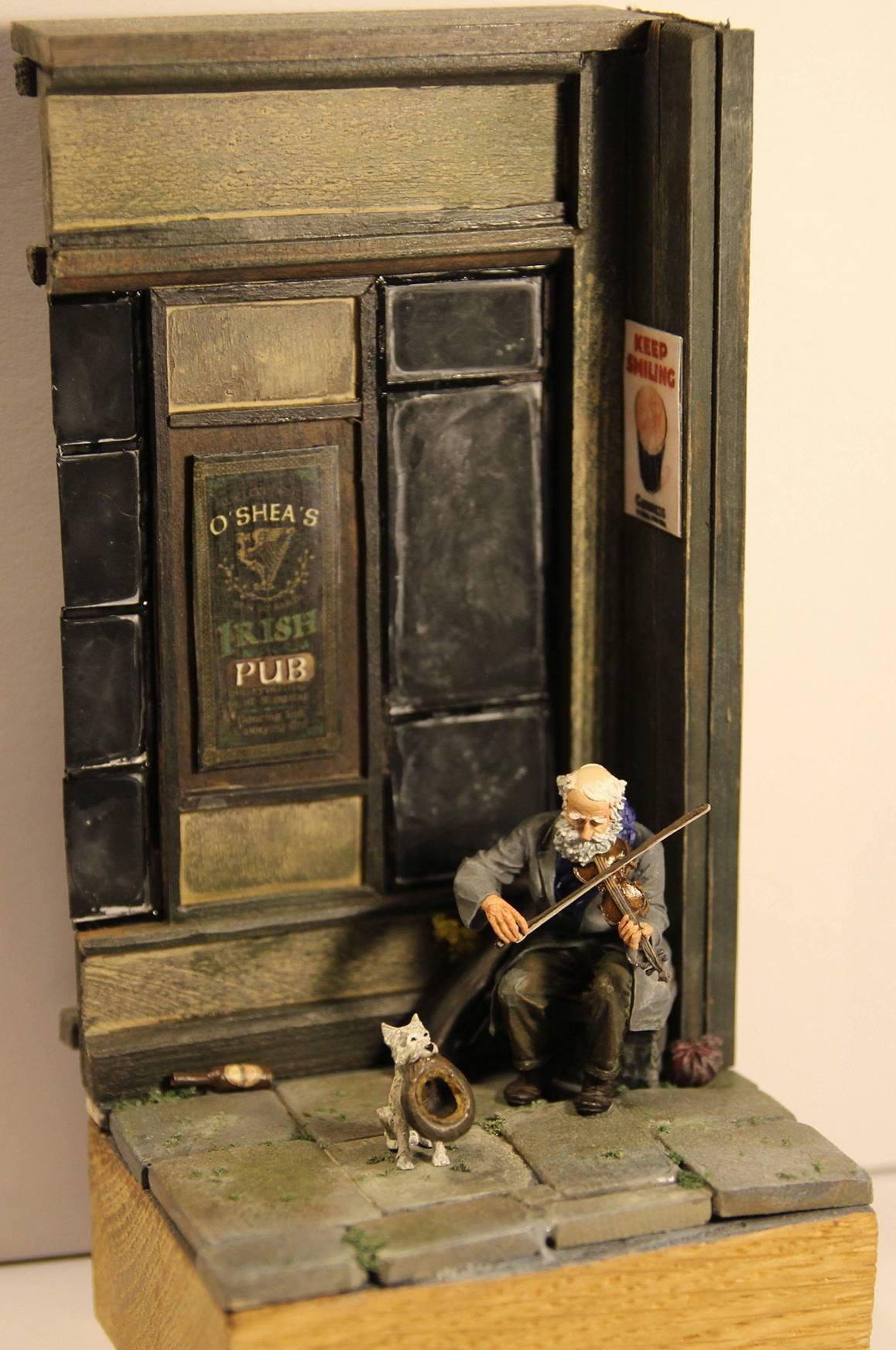 Ganz frisch aus dem Hobbybunker unseres Luca Sing kommt die Zinnfigur „The old Fiddler“, im Maßstab 54mm von Andrea Miniatures. Der Teil eines Pubs im Hintergrund wurde aus verschiedenen Holz- und Evergreenprofilen sowie Plastikfolie gescratcht.